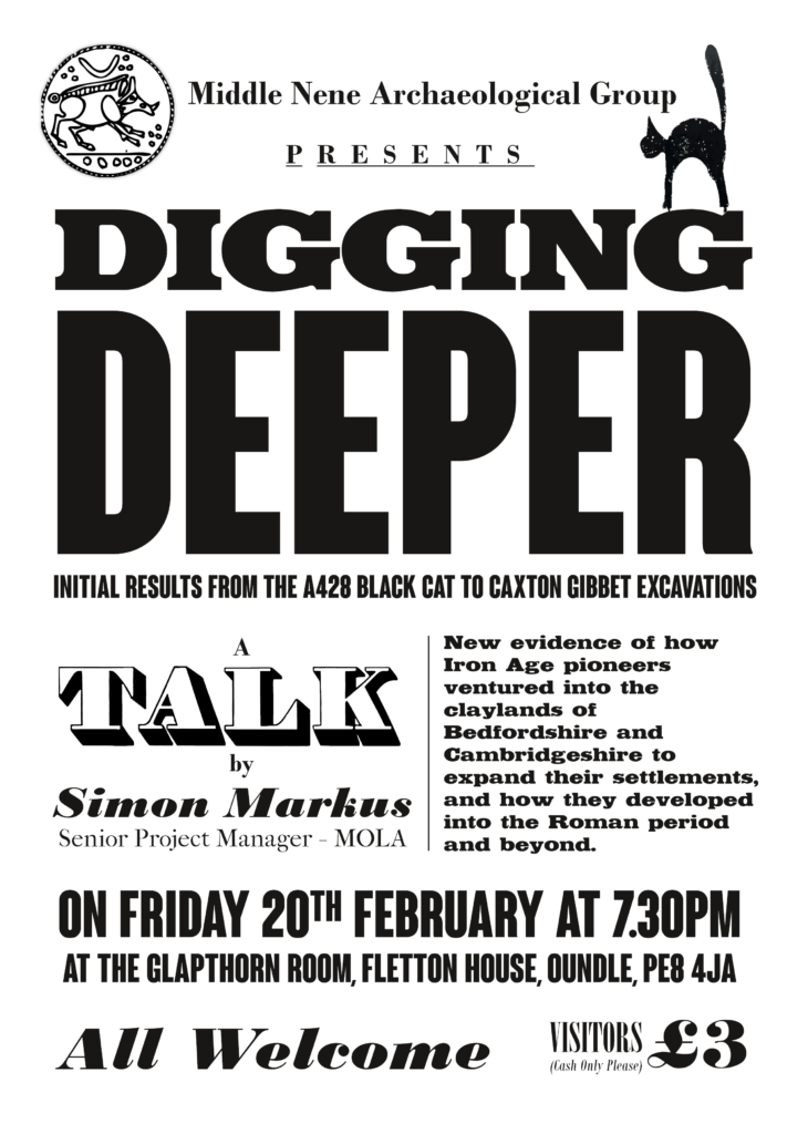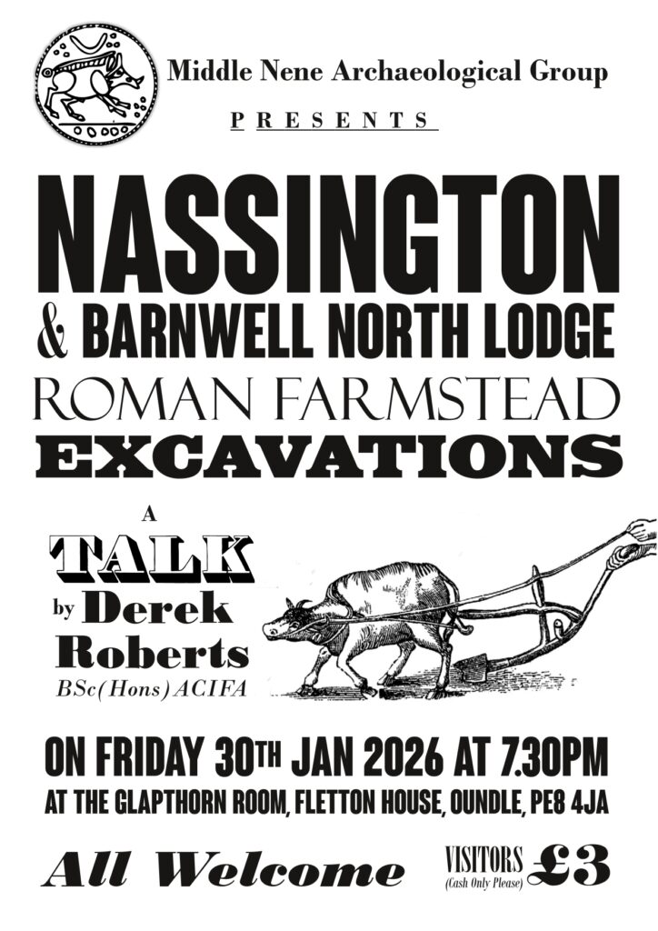 In October 1970 the Nene Valley Archaeological Research Committee suggested the formation of a local group led by John Hadman and Steve Upex to organise excavations, field walking and other events. John and Steve had already supervised some excavations, including Elton and Fotheringhay, but the first indoor meeting of the Middle Nene Archaeological Group took place in February 1971. Over fifty years later the Group is still flourishing.